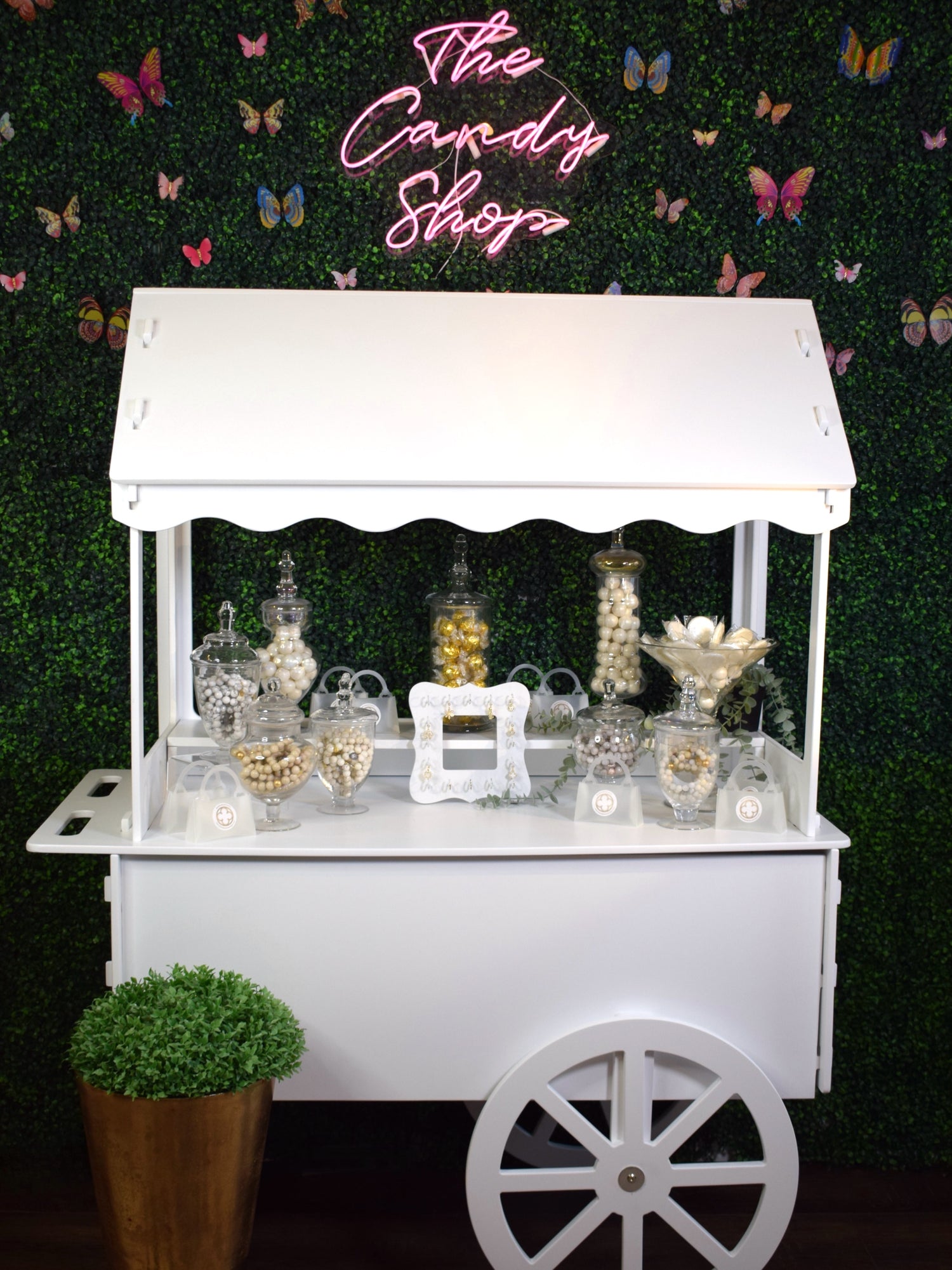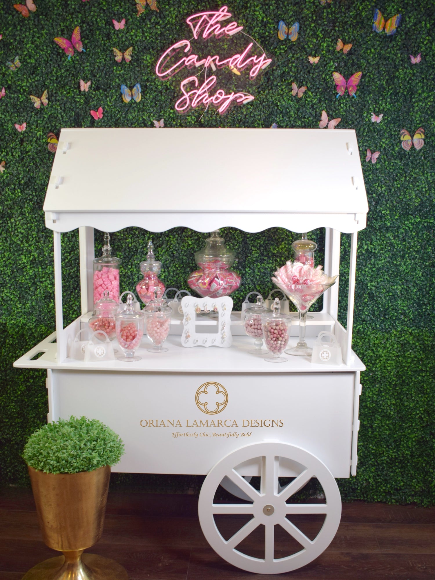Our Armcandy Cart needs a minimum 4’x6’ space for our including our faux greenery backdrop. Packages with additional décor, we recommend setting aside an 8×8 space.